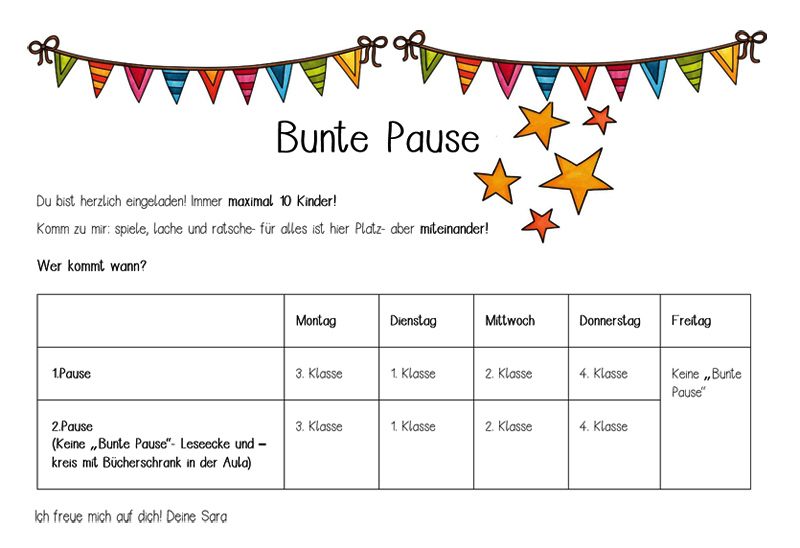 Von Montag bis Donnerstag findet die „Bunte Pause“ nach einem festen Plan statt. Pro Pause dürfen jeweils zehn Kinder teilnehmen und gemeinsam Zeit mit Sara verbringen. Ein Blick auf den Plan lohnt sich also, um keinen Termin zu verpassen!