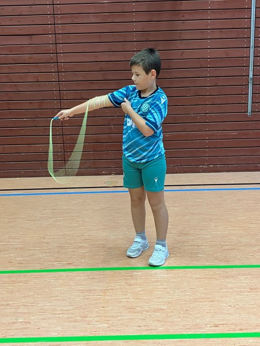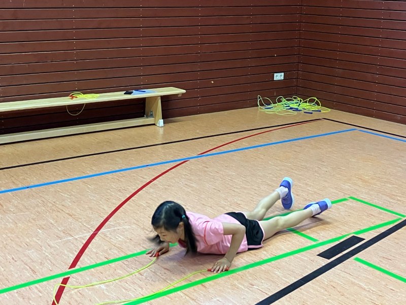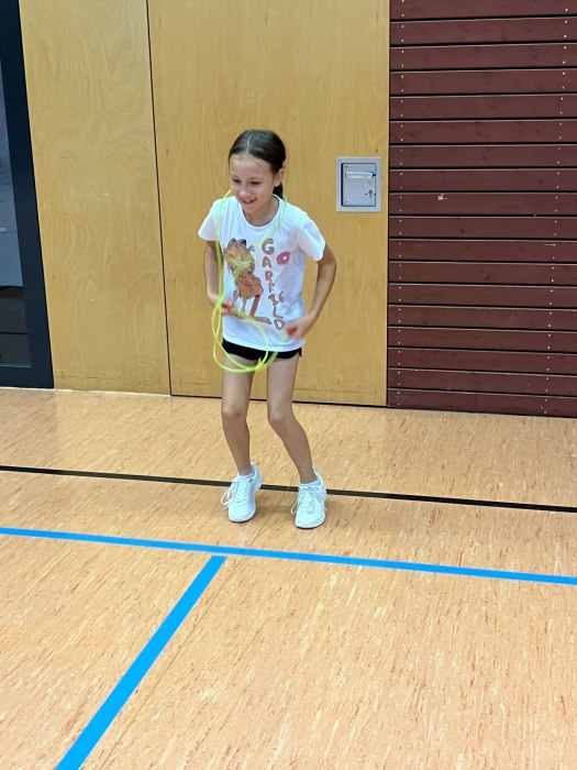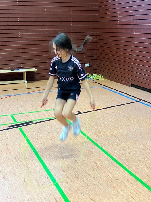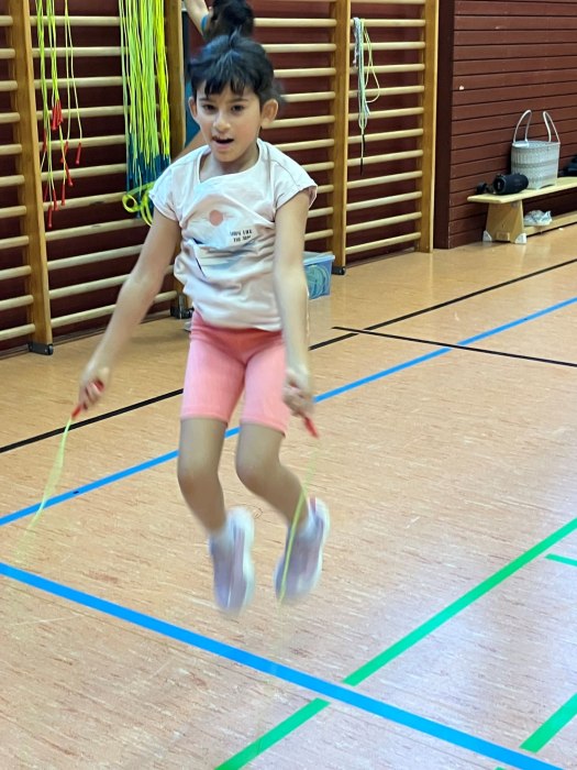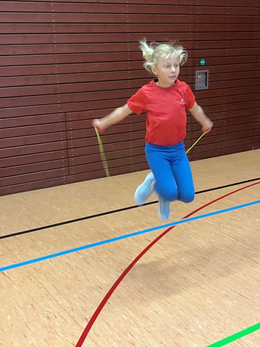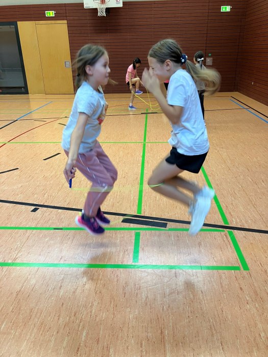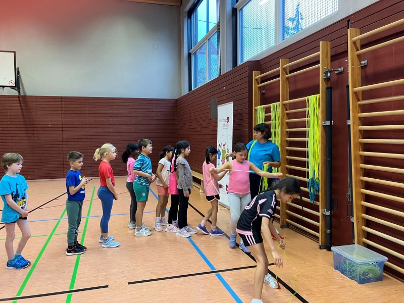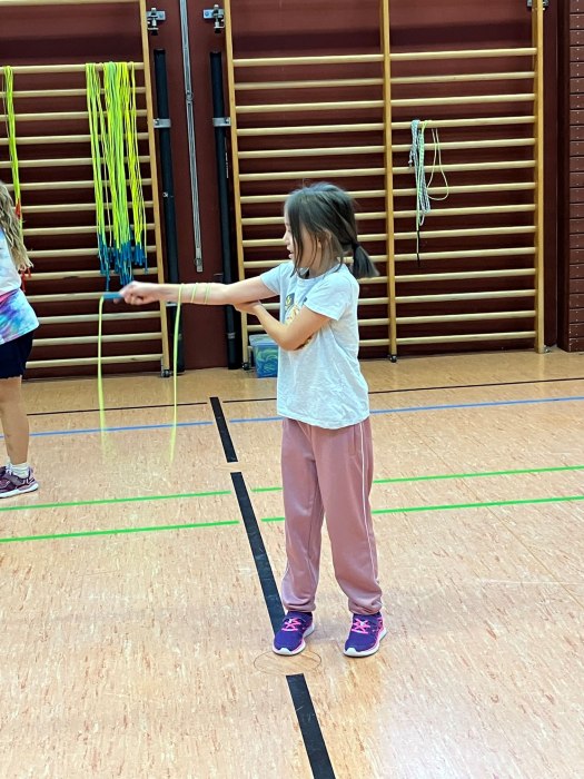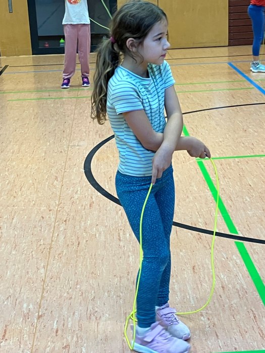 Der Workshopleiterin Frau Haas vermittelte den Drittklässlern in einem zweistündigen Basis-Kurs die sportliche Form des Seilspringens – das „Robe Skipping“. Die Schüler lernten zahlreiche Sprungvarianten kennen, die allein oder zu zweit durchgeführt werden können. Begeistert probierten die Kinder die verschiedenen Sprünge aus und übten fleißig.
